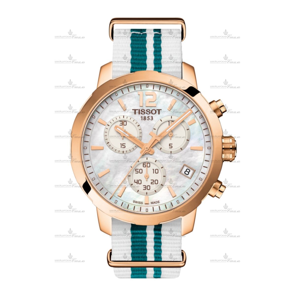 Диаметр: 43 мм. Калибр: ETA G10.212. Кварцевый хронограф. Индикация даты. E.O.L-индикация разряда элемента питания. Тахиметрическая шкала. Часовая шкала: Нарисованные метки. Стрелки: Стальные, золотистые с покрытием SuperLuminova. Белый циферблат. Браслет
