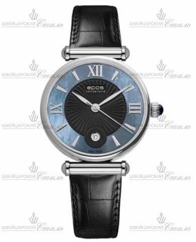 Диаметр: 34 мм. Гильошированный перламутровый циферблат. Индикатор даты. Заводная головка украшена сапфиром в форме кабашона. Цифры римские, индексы. Кожаный ремешок с клипсой
