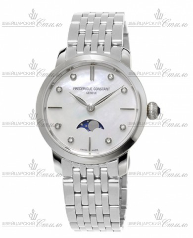 Диаметр: 30 мм. Калибр: FC-206. Фаза луны. Перламутровый циферблат декорирован 8 бриллиантами 0,02 ct. Браслет: нержавеющая сталь